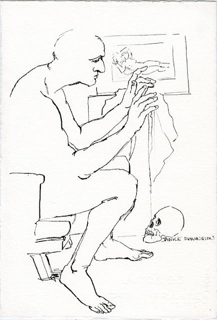 This is my favorite type of drawing. Ink, a simple nib pen, and contour line. I love the visceral scratch and scritch of the ink nib on the paper. I love the moment when you must pause to dip the pen into the ink bottle and while you are dipping the pen you must think and make a decision where to place the pen next and what you want to describe and just how much or little in the next few strokes. And then your pen runs out of the little bit of ink and you must stop, dip again and decide what to leave out, and what to describe with an economy of line.